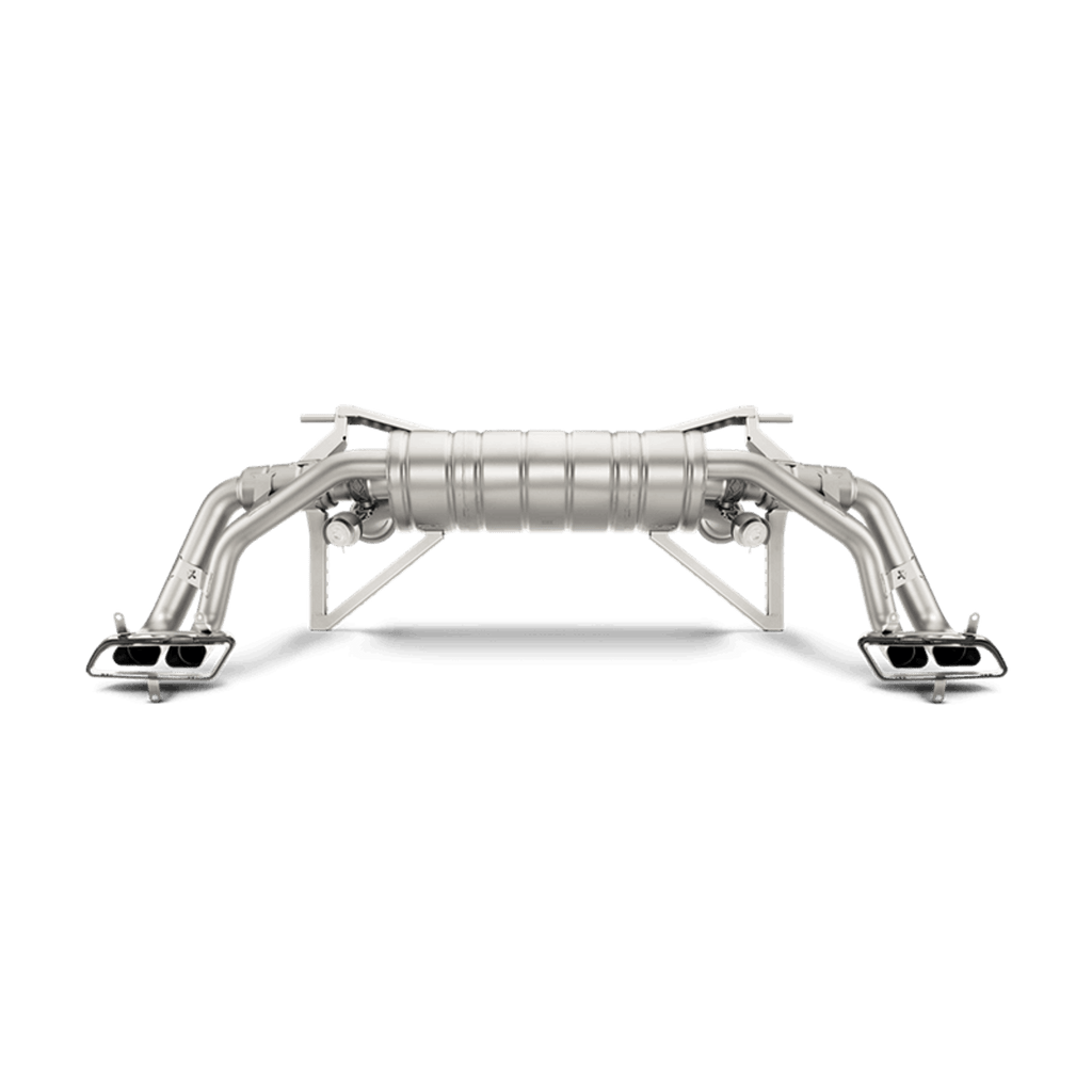 What could make a supercar even better? The answer: lower weight, more power, and an unbelievable change in engine sound thanks to this Akrapovic Slip-On exhaust system. Constructed from our unique titanium alloy, our precision-engineered performance exhaust provides performance advantages over the stock exhaust and, thanks to the engine placement, weight reductions in the vehicle's rear deliver substantially improved handling. The combination of specialized muffler shapes, secondary resonators, and cast titanium dual-mode exhaust valves reduces back pressure and produces an incredible symphony from the V10 engine. Complete the look with a set of two exquisite carbon fibre tailpipes. Select the optional Wireless kit for adjustable sound. Akrapovic 'Slip On Line' Titanium