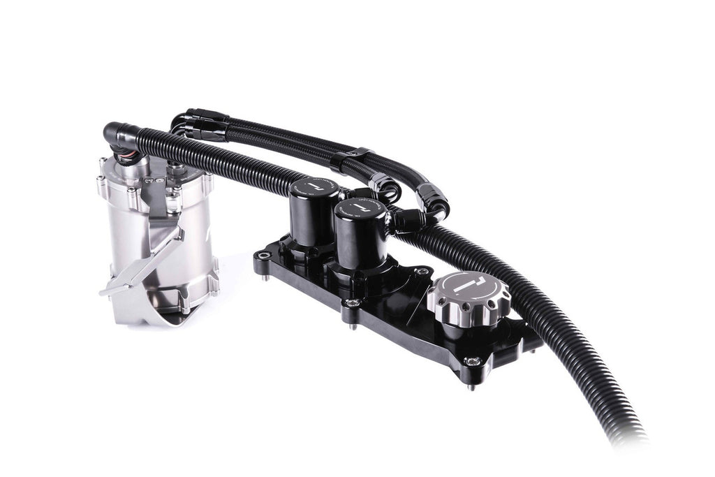 RacingLine’s V6T Catch Can System replaces the factory PCV with a gloss black billet PCV replacement block. This features two internally baffled separator turrets and also deletes the failure-prone factory PCV check valve.